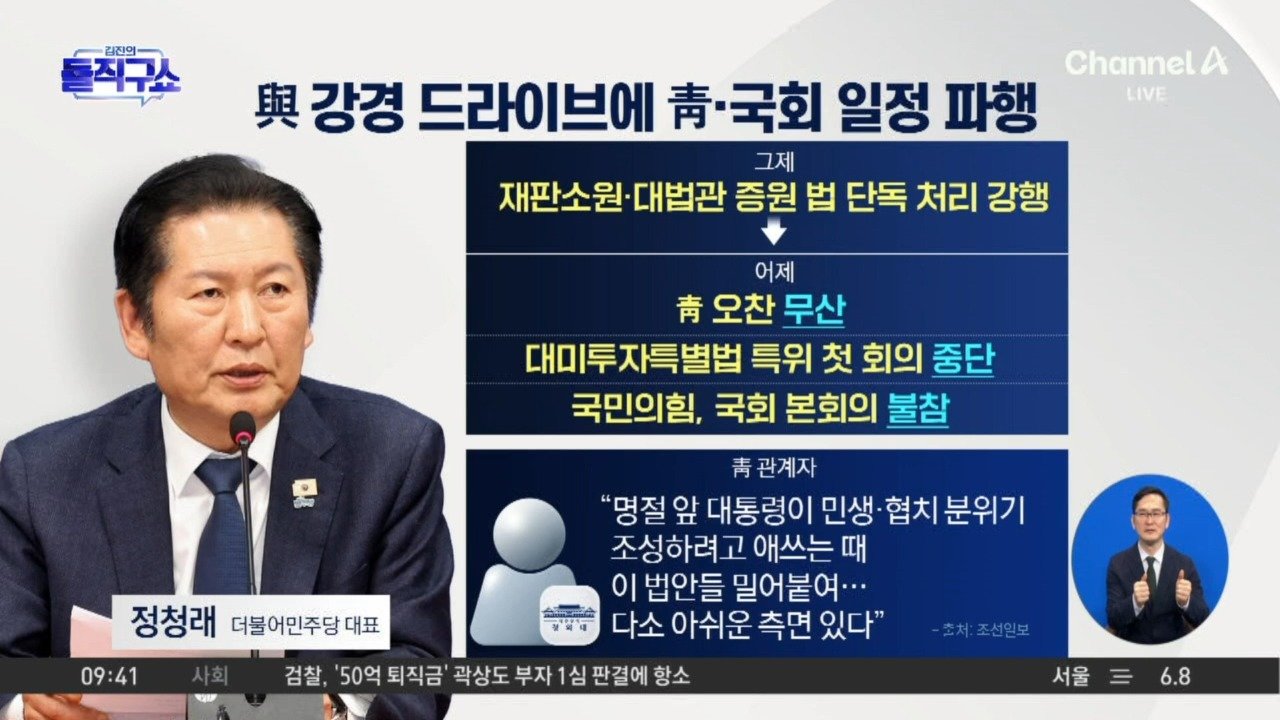 조선 '합당' 코너 몰린 정청래, 강경파 손잡고 사법 개편 드라이브 조국 "민주당 당권 투쟁에 끌어들여… 모욕감" 조국혁신당, 김관영 지사 등 '내란 동조' 혐의 고발 Copyright Ⓒ 채널A. All rights reserved. 무단 전재, 재배포 및 AI학습 이용 금지