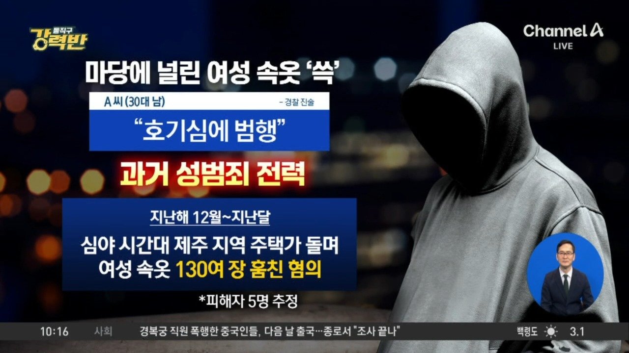 00:51재생중[돌직구 강력반]주택가 돌며 여성 속옷 훔친 30대 남성 구속