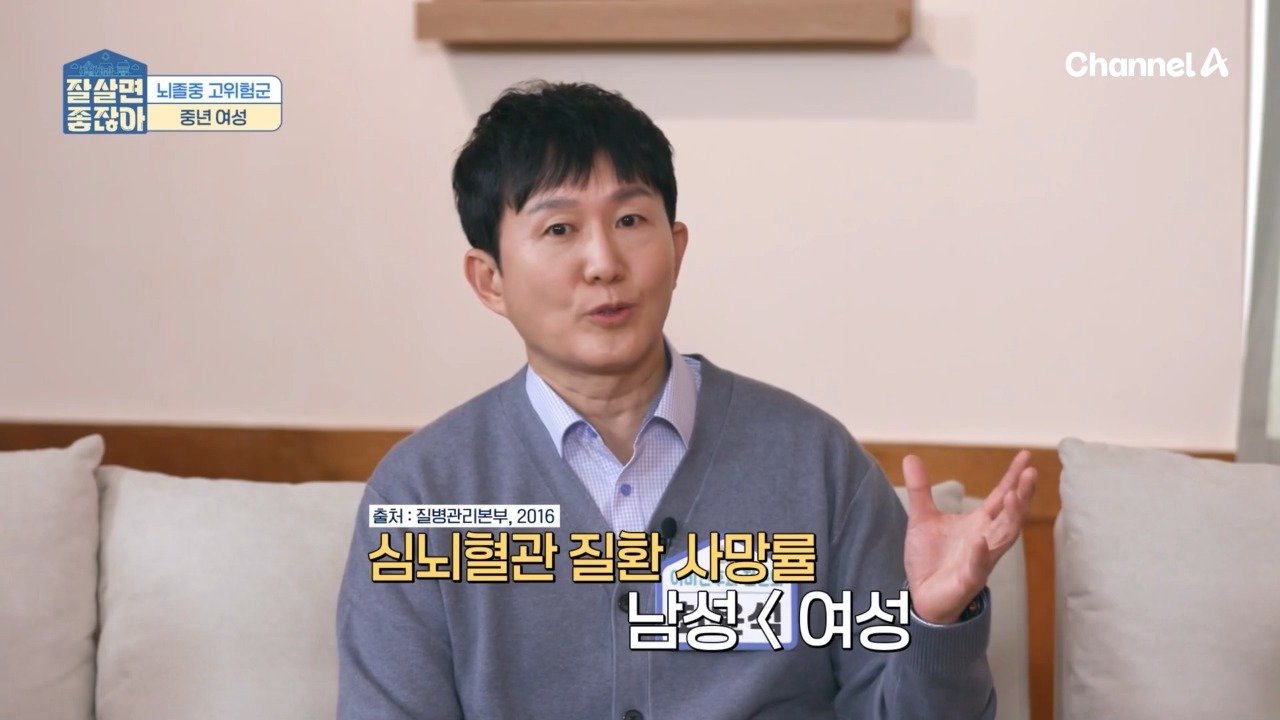 뇌졸중 고위험군은 중년 여성이다? 심뇌혈관 질환 사망률 남성 < 여성 구사일생으로 목숨 구해도 재발 위험 큰 뇌졸중 [잘 살면 좋잖아] 수요일 오후 1시 20분 방송 Copyright Ⓒ 채널A. All rights reserved. 무단 전재, 재배포 및 AI학습 이용 금지